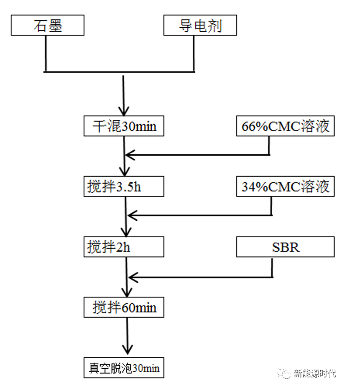 (1)干混:使粉體充分混合,固體之間的混合比在液體下固體間的混合容易多了。同時(shí)防止CMC團(tuán)聚,縮短CMC溶解時(shí)間。(2)捏合:高固含量下漿料比較硬,攪拌槳運(yùn)動(dòng)時(shí)可以對(duì)漿料進(jìn)行摩擦剪切,同時(shí)由于攪拌槳呈麻花結(jié)構(gòu),運(yùn)動(dòng)時(shí)會(huì)對(duì)漿料產(chǎn)生向下的擠壓作用。一方面可以使大顆粒破碎掉,另外使CMC包覆在石墨表面,由于CMC帶正電,包覆在石墨表面后形成雙電層結(jié)構(gòu),石墨間由于靜電排斥,可以防止石墨顆粒間團(tuán)聚。生產(chǎn)采用60~63%固含量攪拌,出于對(duì)設(shè)備損耗的考慮,由于生產(chǎn)采用200L和650L的攪拌罐,高固含量下,電機(jī)功率無(wú)法承受,因此采用低粘度攪拌。低粘度下不利于CMC的包覆,因此攪拌時(shí)間須延長(zhǎng)。(3)第二步加CMC:CMC分子鏈基團(tuán)與水分子存在氫鍵作用,懸浮在溶液中形成龐大的空間位阻,防止?jié){料沉降。(4)攪拌分散時(shí)間:使CMC充分溶解。生產(chǎn)采用2h攪拌是利用漿料剪切變稀的原理降低漿料粘度,使?jié){料可以做到較高固含量。